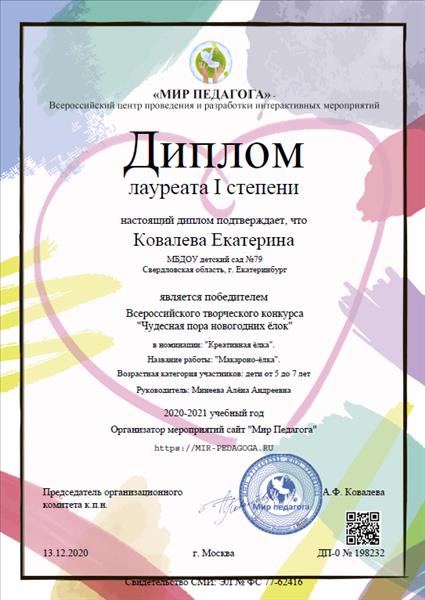 | Всероссийский творческий конкурс "Чудесная пора новогодних ёлок". Номинация: "Креативная елка". Название работы: "Макароно-ёлка". Участник: Ковалева Екатерина, воспитанница средней группы. Возрастная категория участника: дети от 5 до 7 лет. Руководитель: Минеева Алена Андреевна. Организатор: «Мир Педагога» - Всероссийский центр проведения и разработки интерактивных мероприятий. 13.12.2020 |